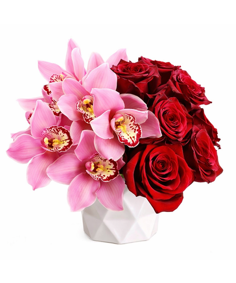 The "French Kiss" bouquet is a romantic and sophisticated arrangement that combines the elegance of red roses with the exotic beauty of green cymbidium orchids. Presented in a small, chic container, this bouquet offers an intimate and stunning display, perfect for expressing love and admiration.