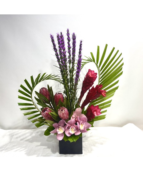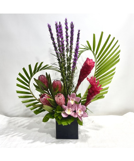 This display of fine exotic blooms is sure to ingite passions. Elegant, feathery spires of liatris are accompanied by pink protea and delicate cymbidium orchids. Flaming red ginger lends a touch of ethereal magic. Sheltered within an open heart leaf-sculptured heart, this distinctive bouquet delivers your promise of the ultimate love, blooming in paradise.